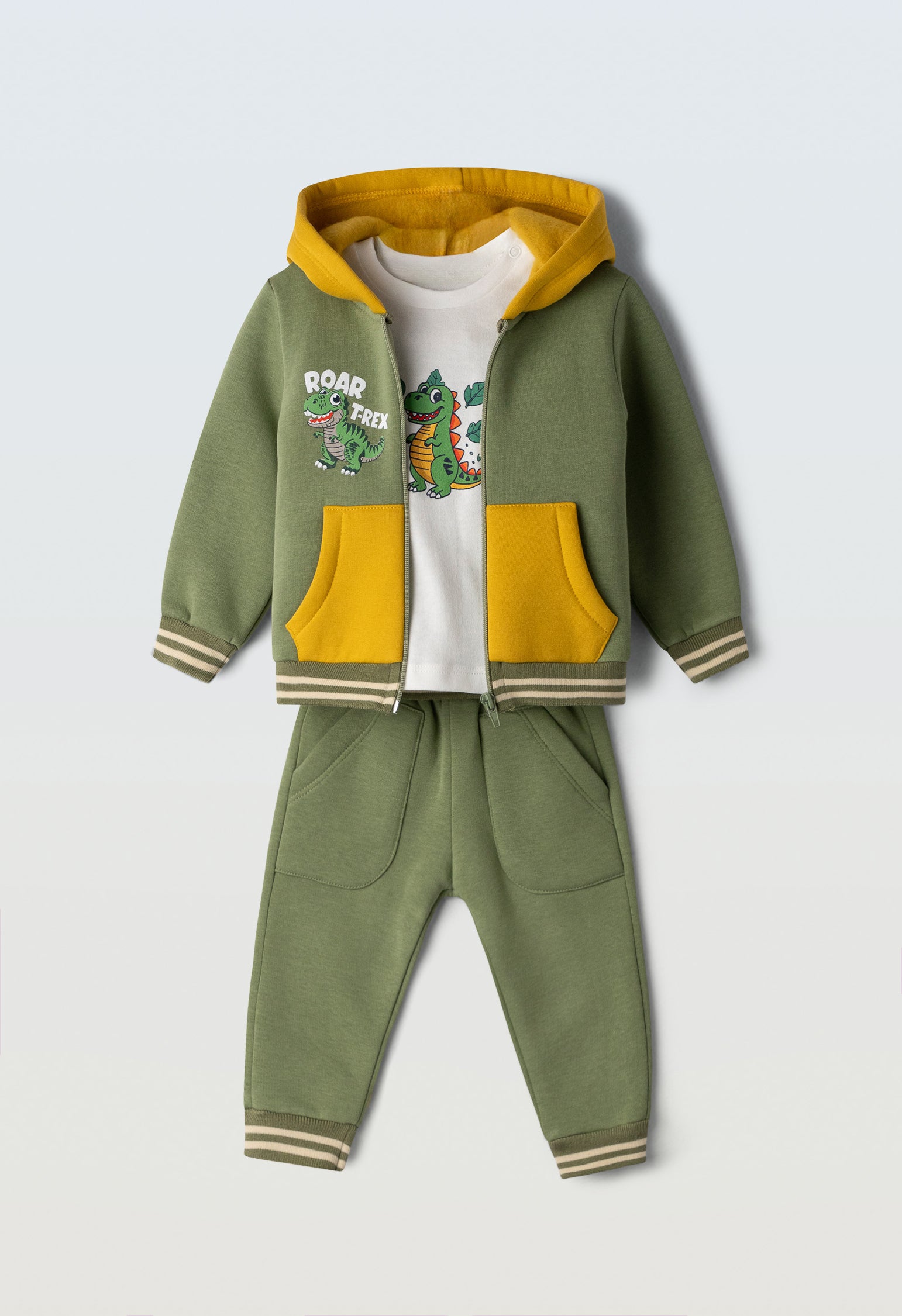 Dress your little adventurer in this playful 3-piece tracksuit featuring a green and mustard bomber-style jacket, cosy matching joggers, and a white long-sleeved top adorned with a fun dinosaur print. Perfect for active days, this set combines comfort and style to keep your baby boy looking cute while exploring the world.