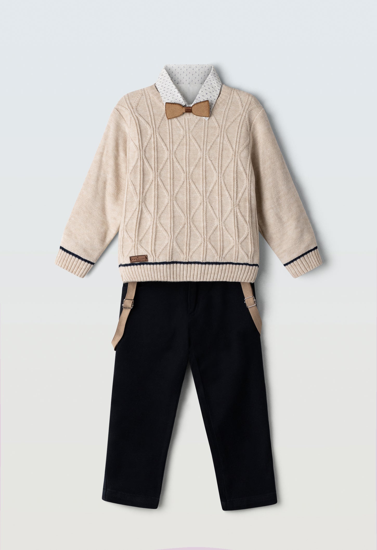 Dress your little gentleman in this playful boys' beige 3-piece set, featuring a cosy jumper, crisp shirt, and navy trousers complete with braces and a dicky bow. Perfect for smart occasions, this outfit combines comfort with stylish charm to keep him looking sharp and feeling confident all day long.