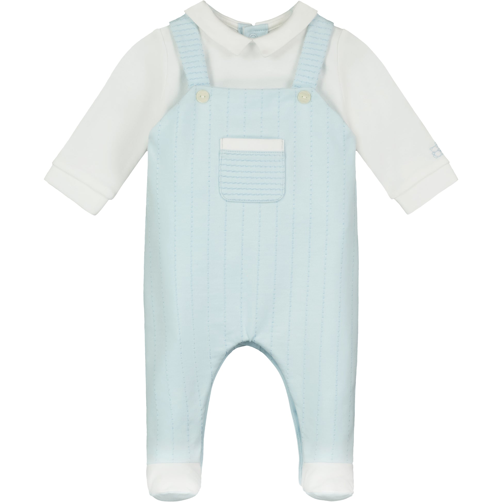 Fox is a smart and practical outfit for baby boys; a lovely new baby gift. This dungaree set gives the impression of a two piece but has a long sleeve, white mock shirt body and blue dungarees. Embroidered vertical stripes, a little white trimmed pocket and buttoned braces finish off the look. A perfect addition to any little boys wardrobe.