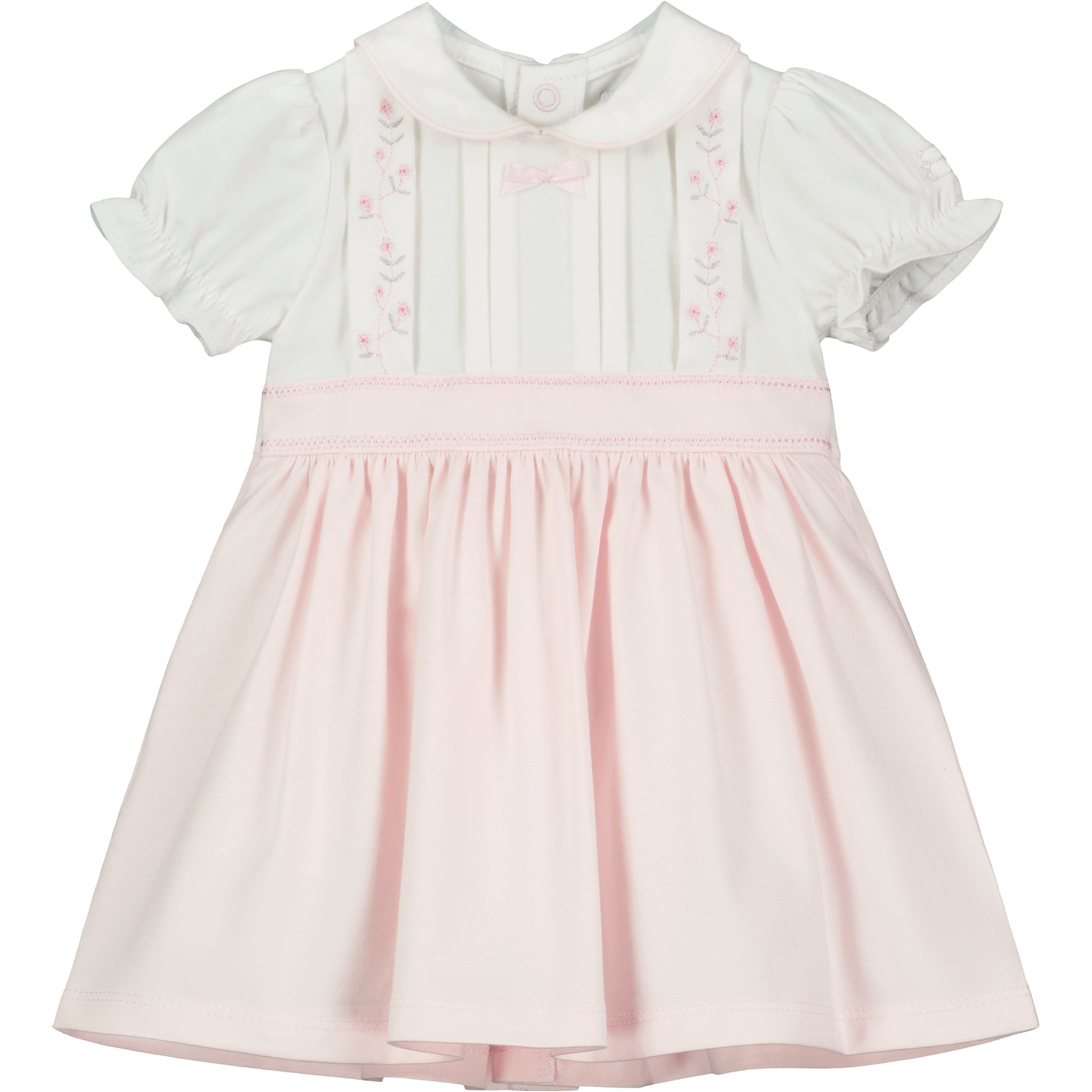 The top half of this beautiful dress is white with gorgeous embroidery in shades of pink & grey and pintuck pleats running vertically from collar to waist. More embroidery on the pink waistband separates the white top from the full pink skirt. Piping, satin bows, puff sleeves and matching pink pants are lovely finishing touches to this perfect party piece.