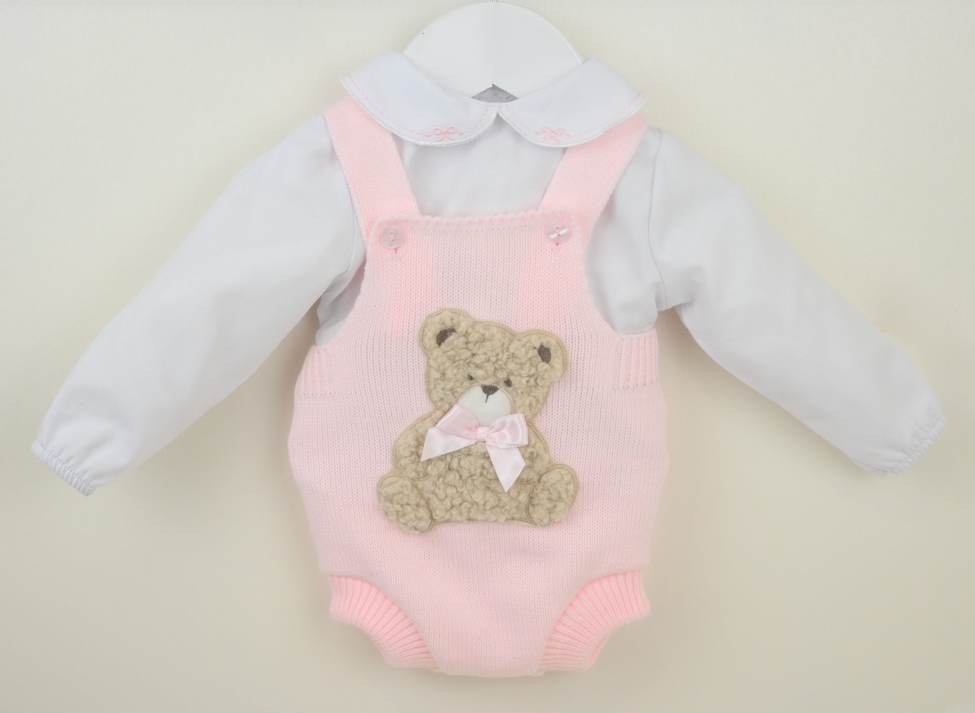 A beautiful little two-piece set, a pastel pink knitted dungaree suit with a cute furry bear applique complete with pink silky bow. Underneath there is a softly brushed cotton blouse with dainty bow embroideries at the collar.