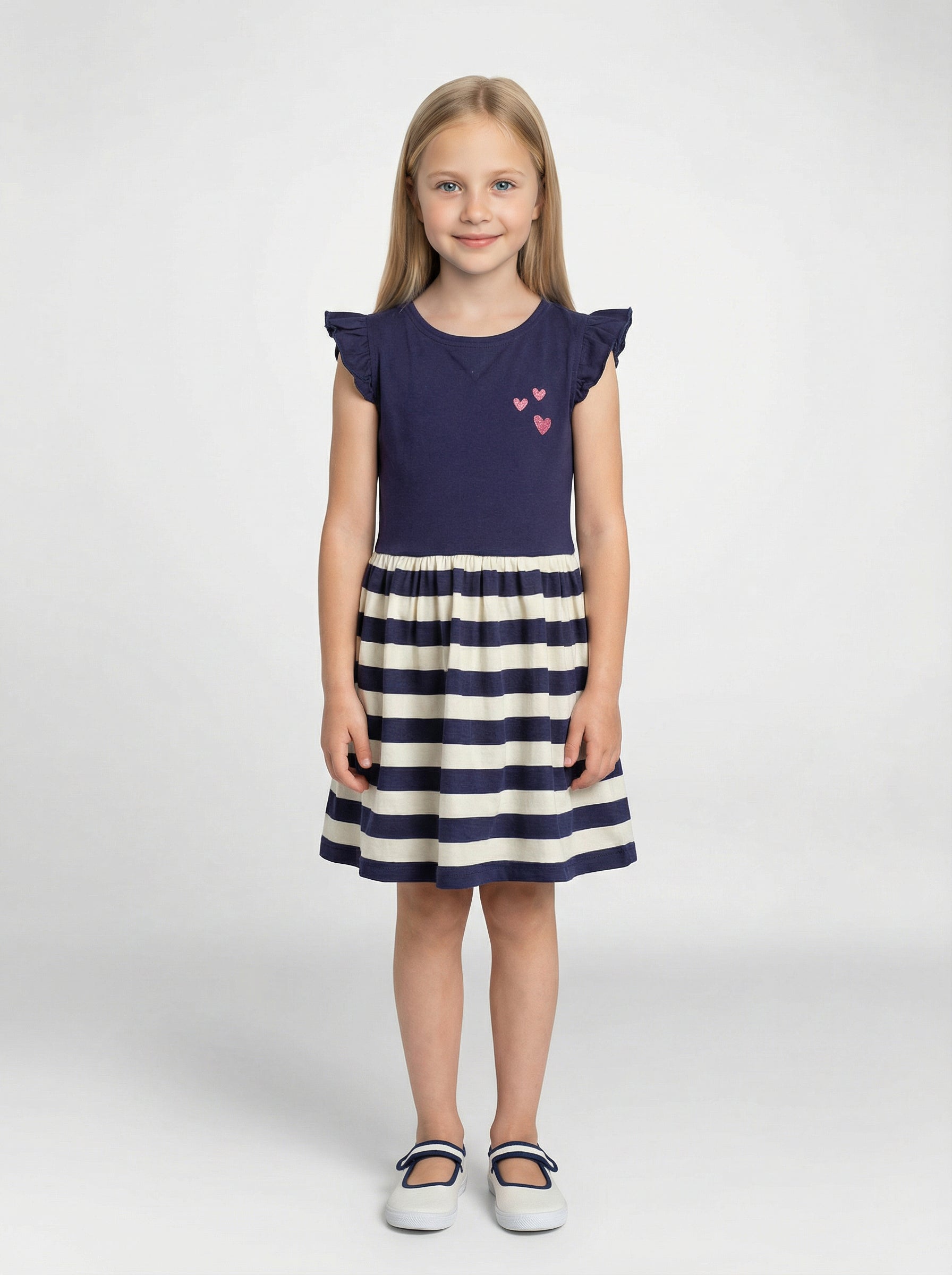 Girls Navy Dress with charming stripes that'll have her twirling all day long! Perfect for playdates, parties, or everyday adventures, this cheerful frock combines classic navy with fun striped detailing. Soft, comfortable fabric keeps her moving freely while the timeless design works for any occasion. A wardrobe essential that's as practical as it is pretty!
