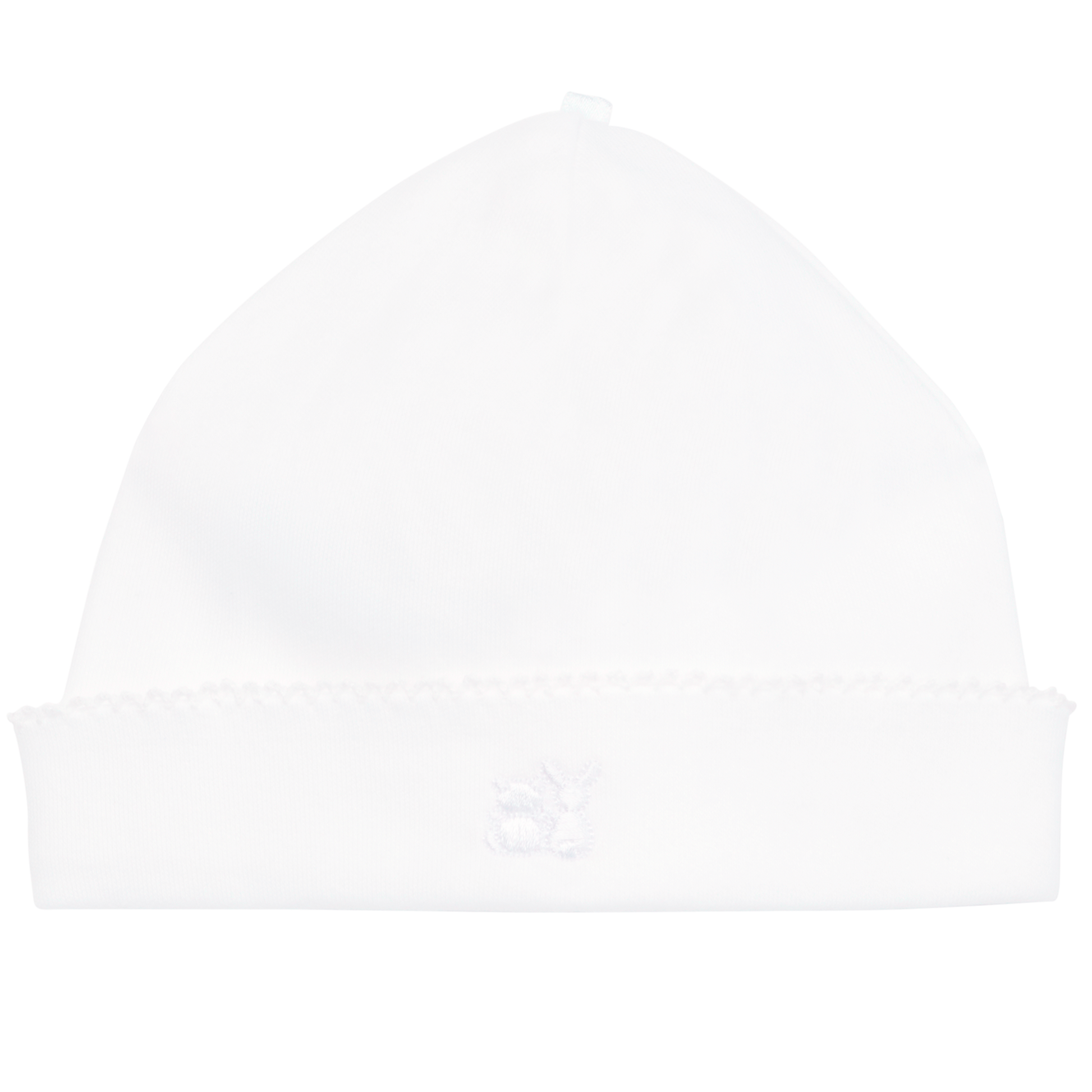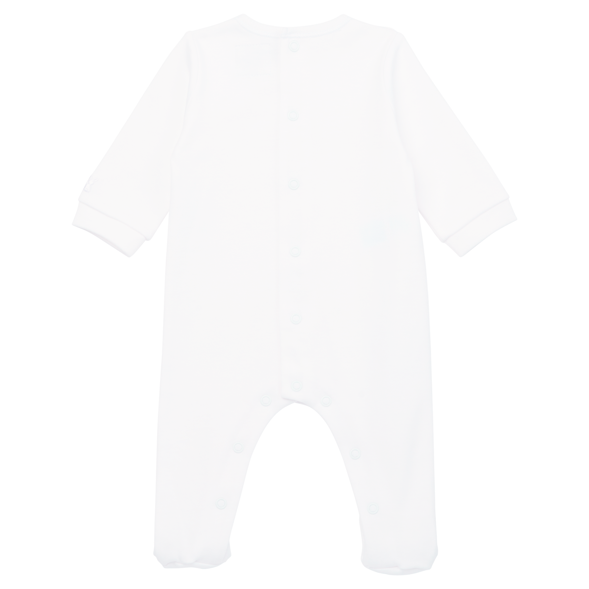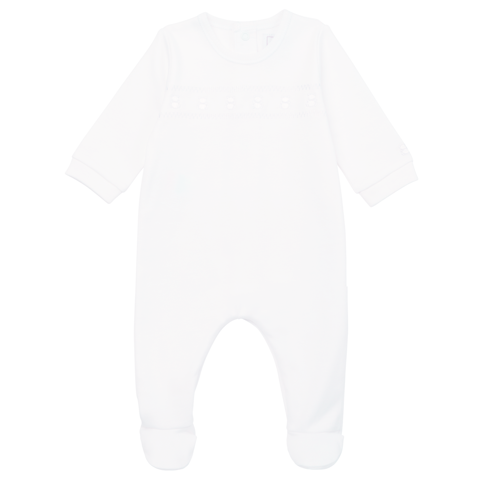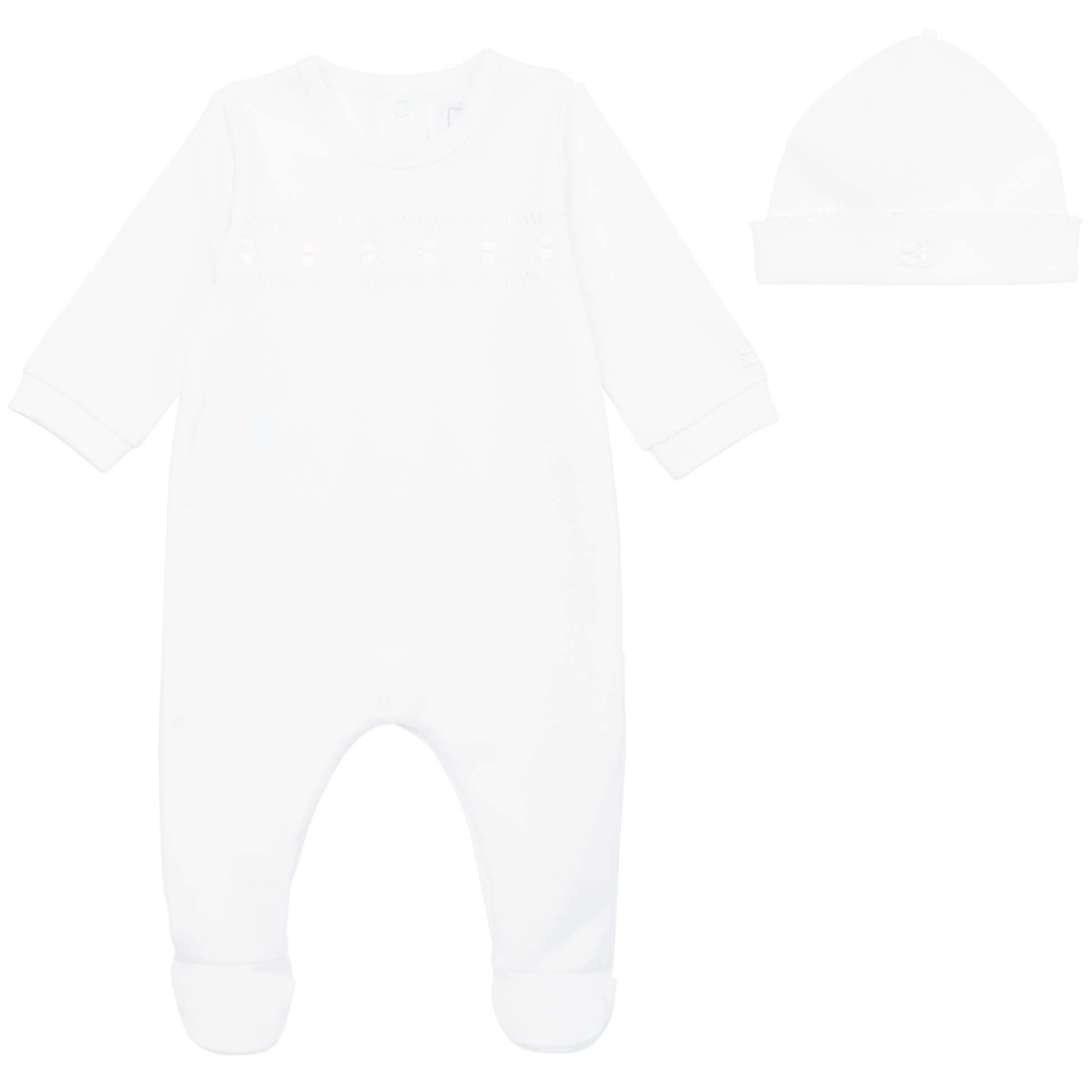 As classic as it is practical, this all white, all in one has adorable Emile Bear chest embroidery. With a soft round neck and relaxed fit for comfort and with a matching hat to complete the set, this is the perfect newborn gift for your little surprise!