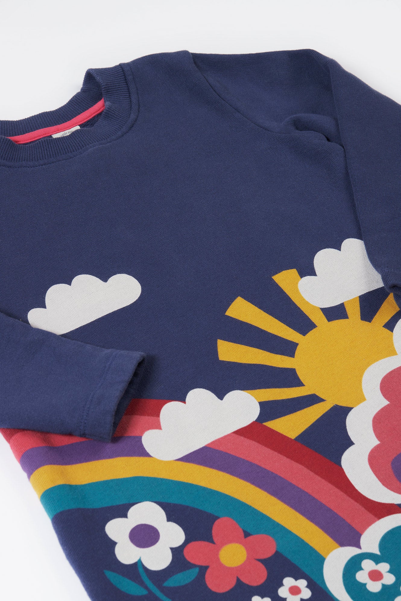 Brighten your little girl's day with the Kari Rainbow Dress in navy. This playful dress features a charming rainbow design that adds a splash of fun to any occasion. Made from soft, comfortable fabric, it’s perfect for twirling and playing all day long. The vibrant colours pop beautifully against the navy background, making this dress a cheerful addition to her wardrobe. Easy to wear and full of personality, the Kari Rainbow Dress is sure to inspire endless smiles.