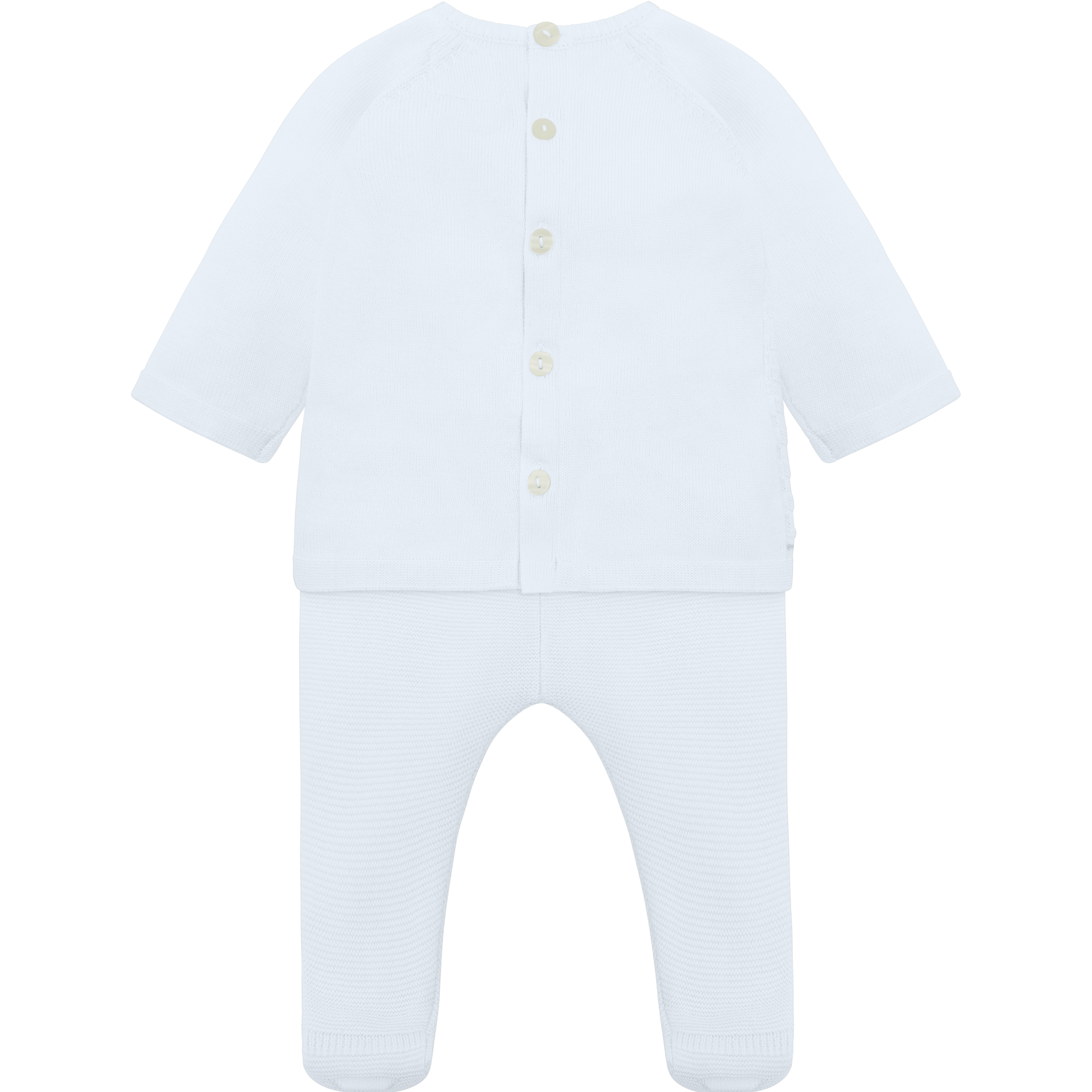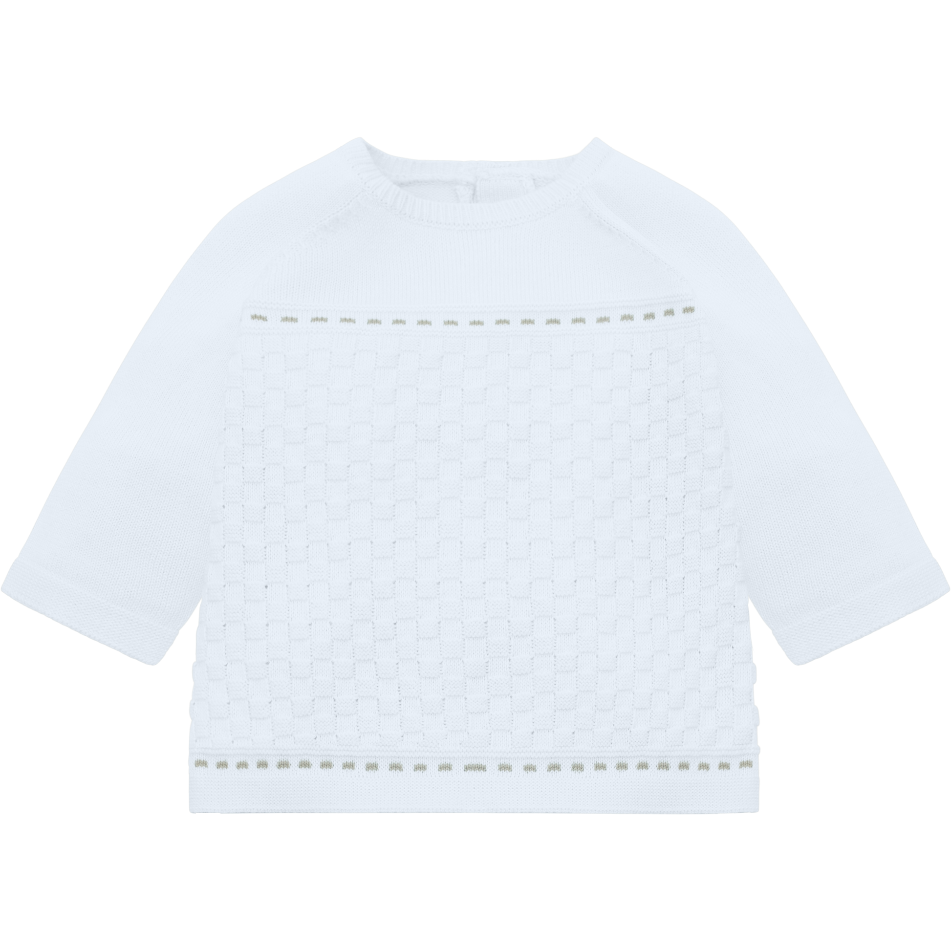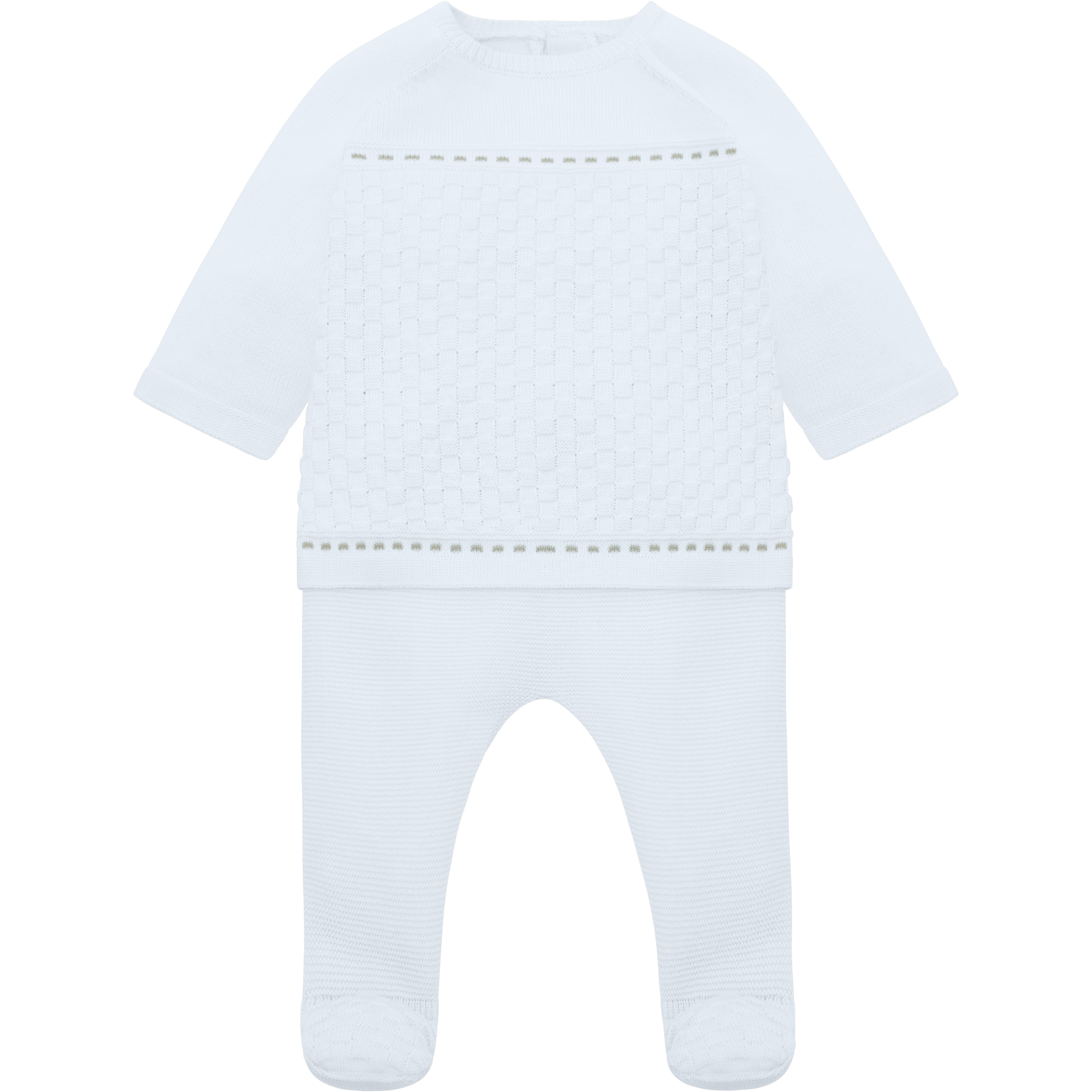 Perfect for any occasion this knitted outfit should be part of any little boys’ wardrobe. The round neck jumper is in a raglan style with a basket pattern and grid design. This patterned section is framed by a row of grey knitted dashes. The new style, foot-in leggings also have this basket pattern on the feet and a stretchy waist for baby's comfort. The set comes with a matching pull on hat.