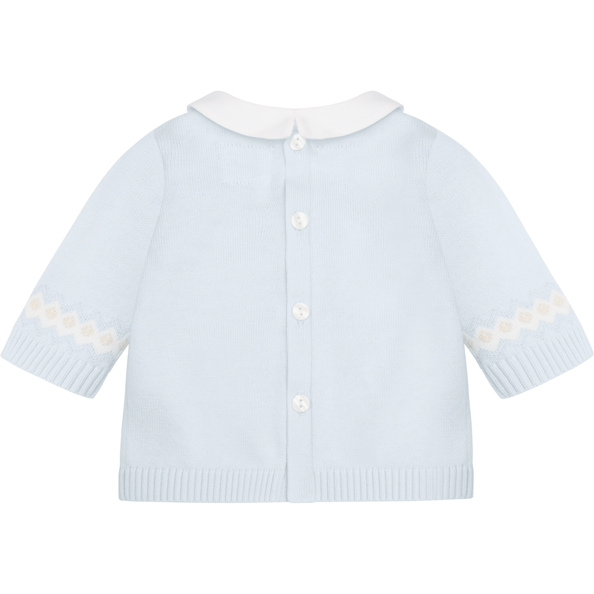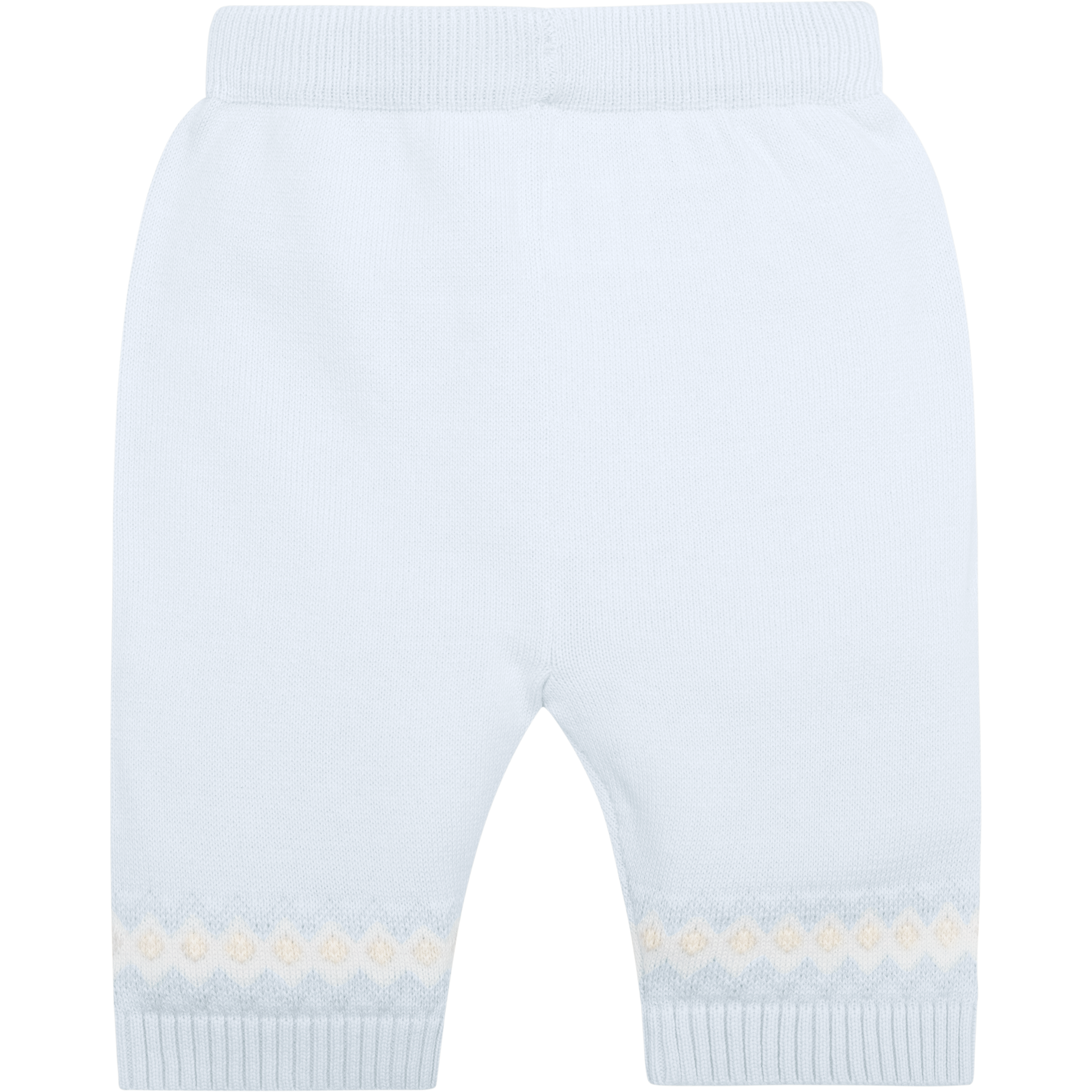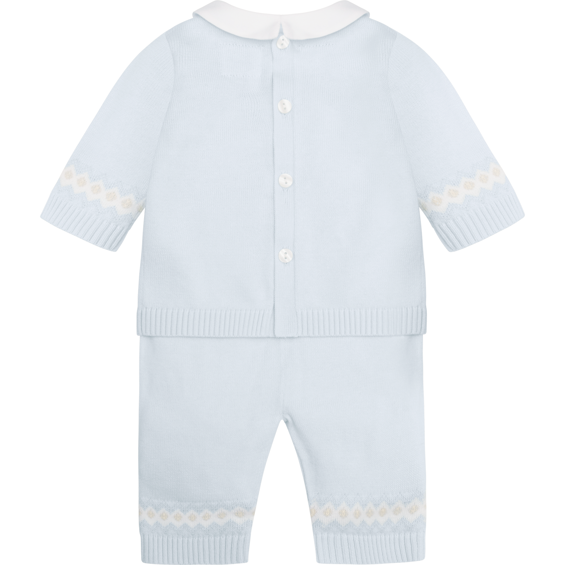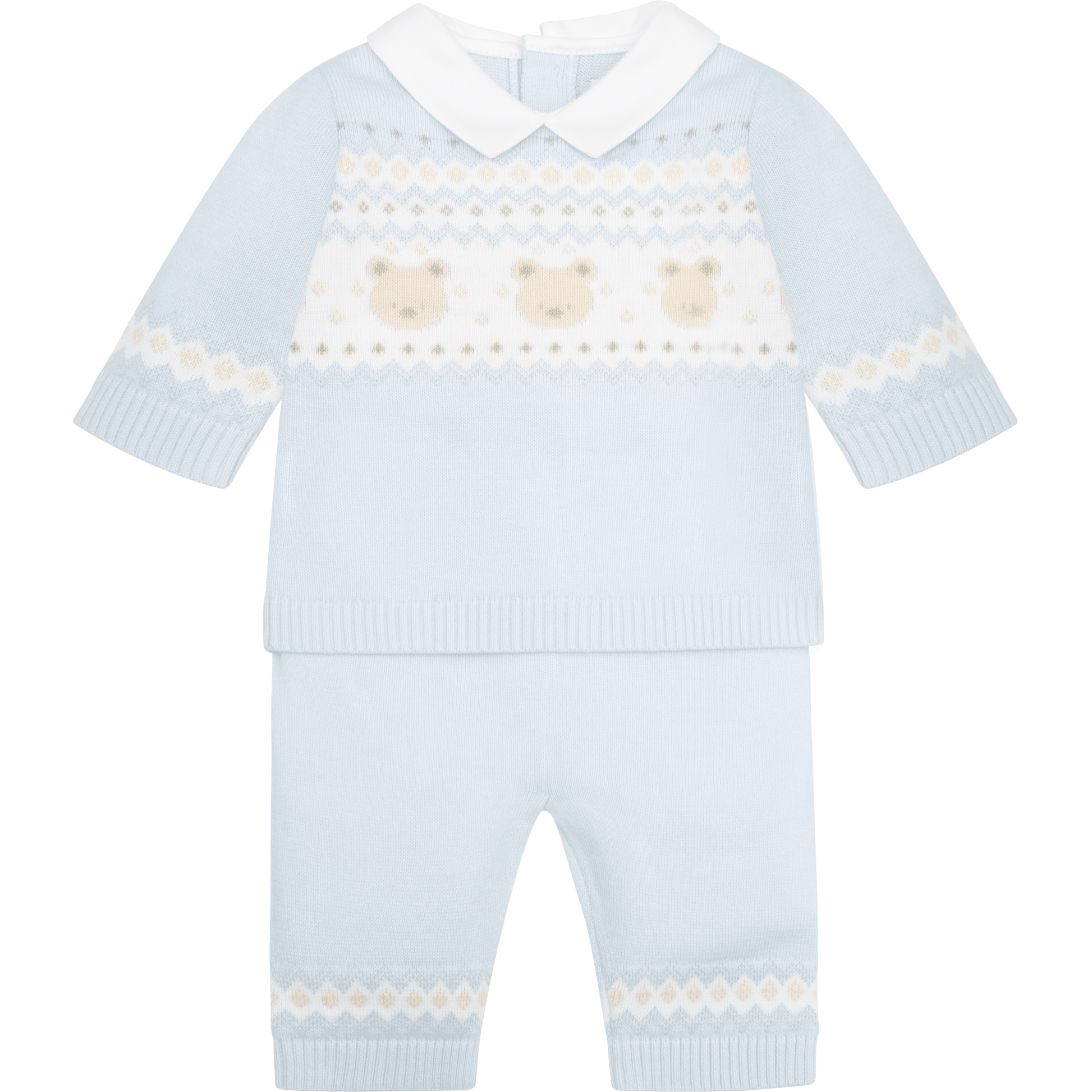 Similar to Kristian, Kipling is a cosy, beautifully knitted, two piece. The top comprises of the same striking white, blue, stone and grey fairisle design across the chest which frames a line of adorable teddy heads. This fairisle design is repeated on the wrists and ankles of the leggings and a lovely matching hat completes this set. Also available in stone.