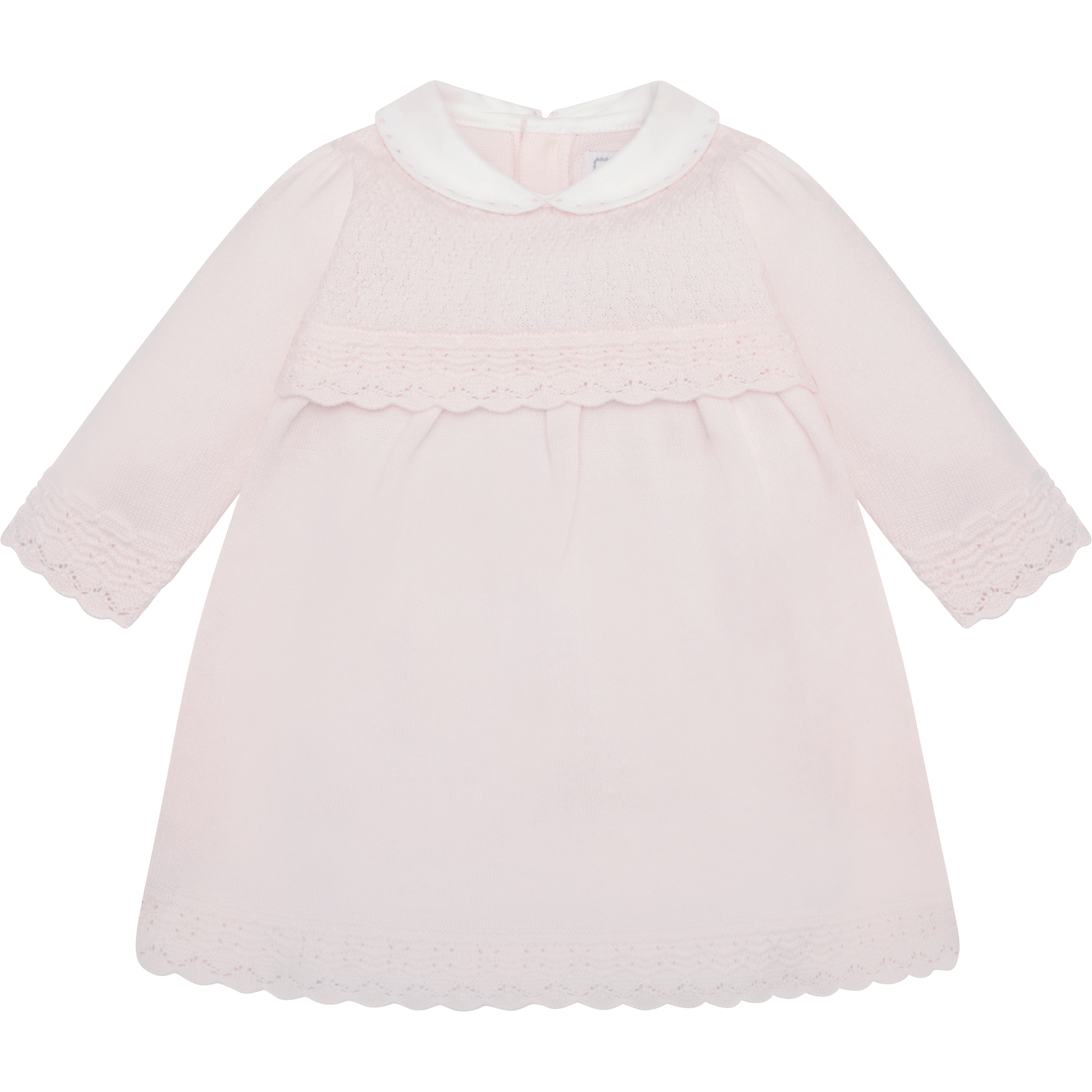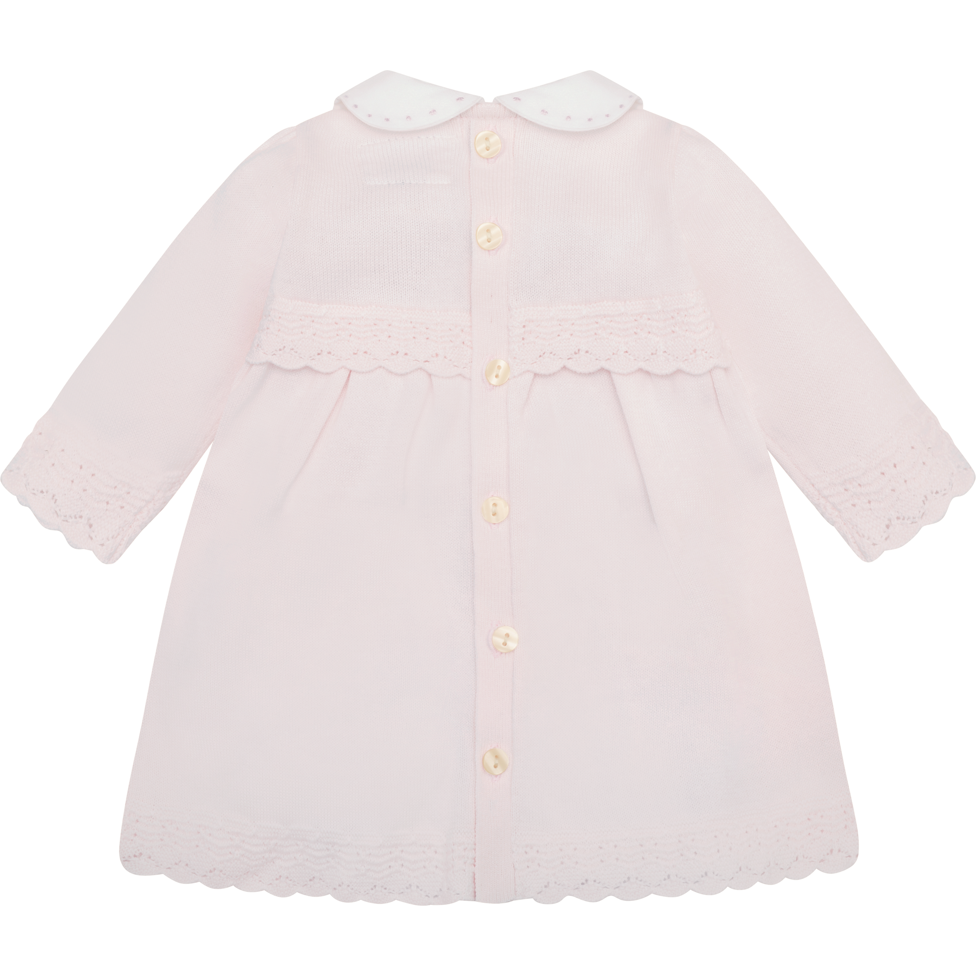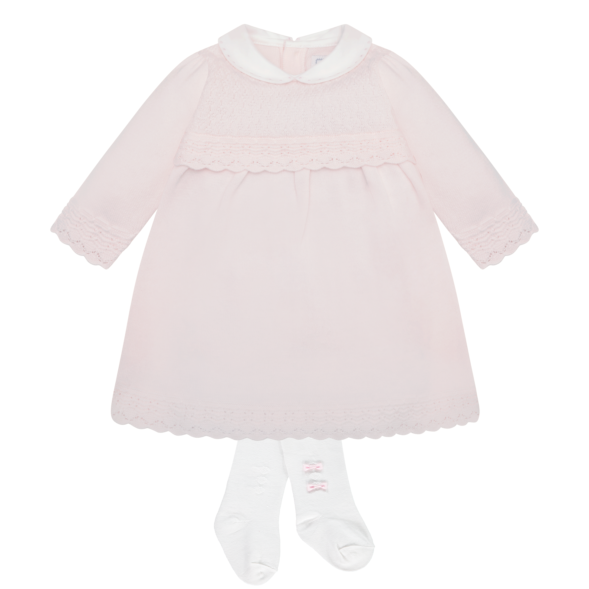 Continuing our lace and scallop edge knitwear theme, our Kara Dress is another option. The yoke has intricate stitching in a flower design with a spot embroidered rounded white collar. This combines beautifully with the ornate sleeves and hemline. Pearlised buttons on the back of the dress and white tights with sweet little pink satin bows, add lovely finishing touches to this beautiful outfit