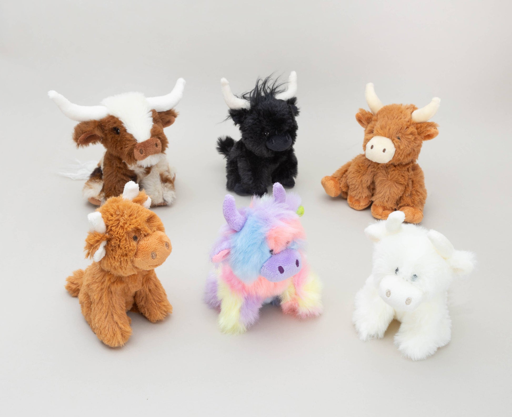 Mini Horny Highland Cow Plush Baby Soft Toy - 11cm. DESIGNED BY HAND IN A LITTLE VILLAGE IN THE COUNTRYSIDE OF LEICESTERSHIRE. Ideal gifts for Christmas, Birthdays, Halloween, Valentine's Day, Spring, Easter, Mardi Gras, Back to School, any occasion or just because!! An adorable quality soft toy suitable for babies, children and grown-ups! Quirky, charming, loveable and oh-so very soft. High quality, brushable hair. A perfect gift for all ages. Made of 100% plush, new materials only. Completely machine washable. Every detail put together with love. CE/ UKCA SUITABLE FROM BIRTH, VEGAN, SUSTAINABLY MADE.