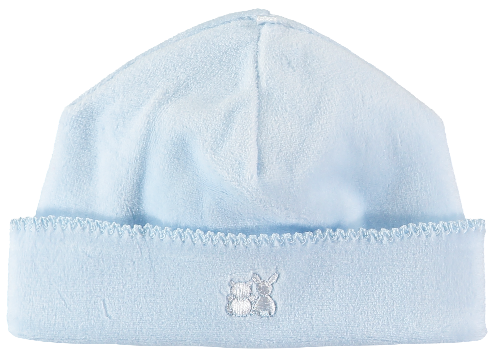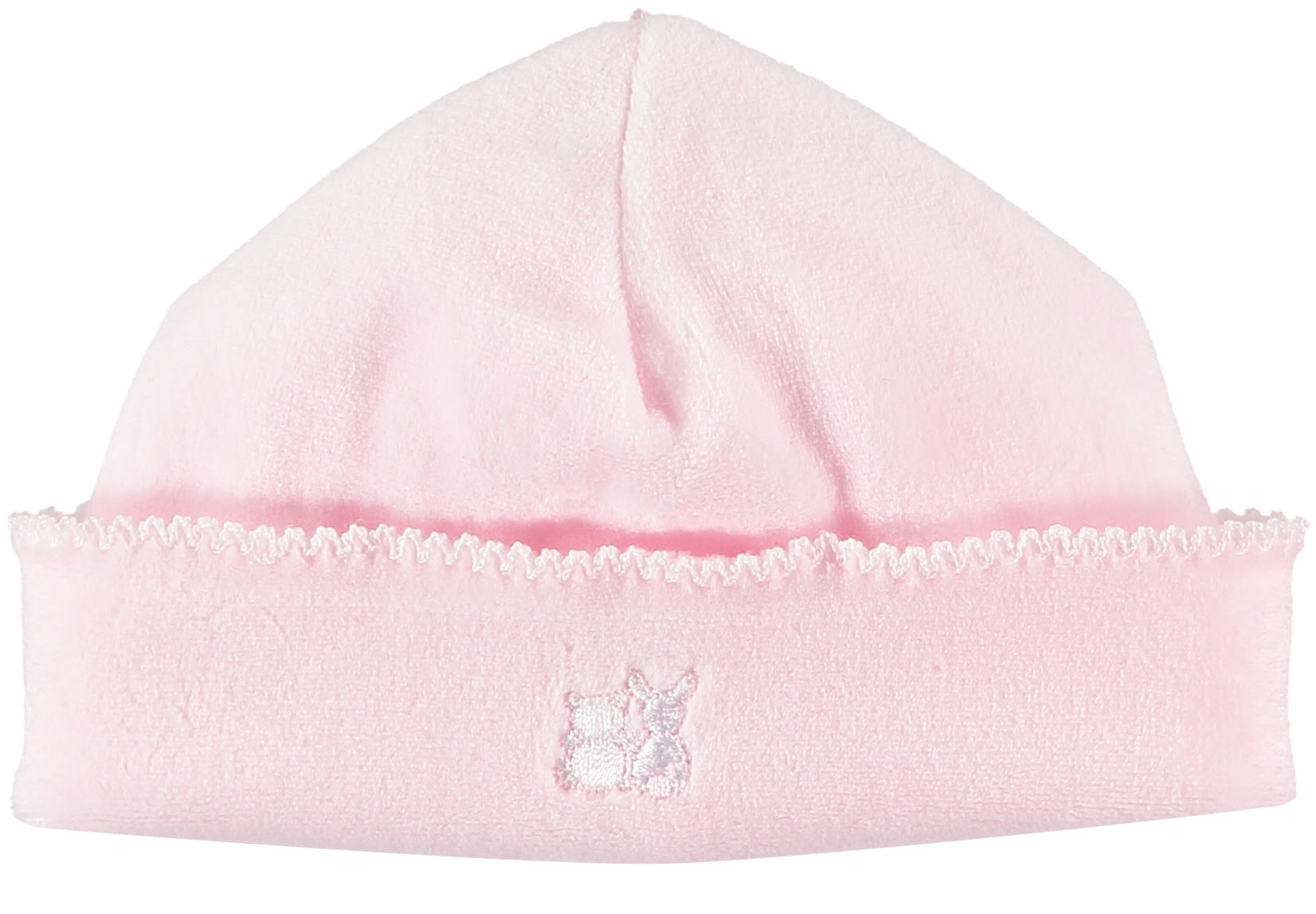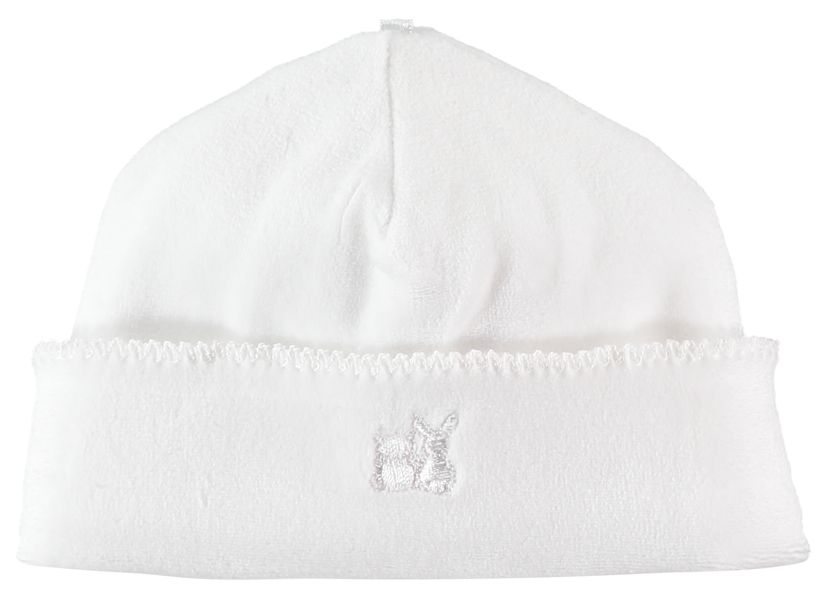 Keep baby warm with this simple but luxurious pull on hat in white velour which is turned up at the hem. The hat will match perfectly with any Emile et Rose garment and carries our embroidered signature logo.