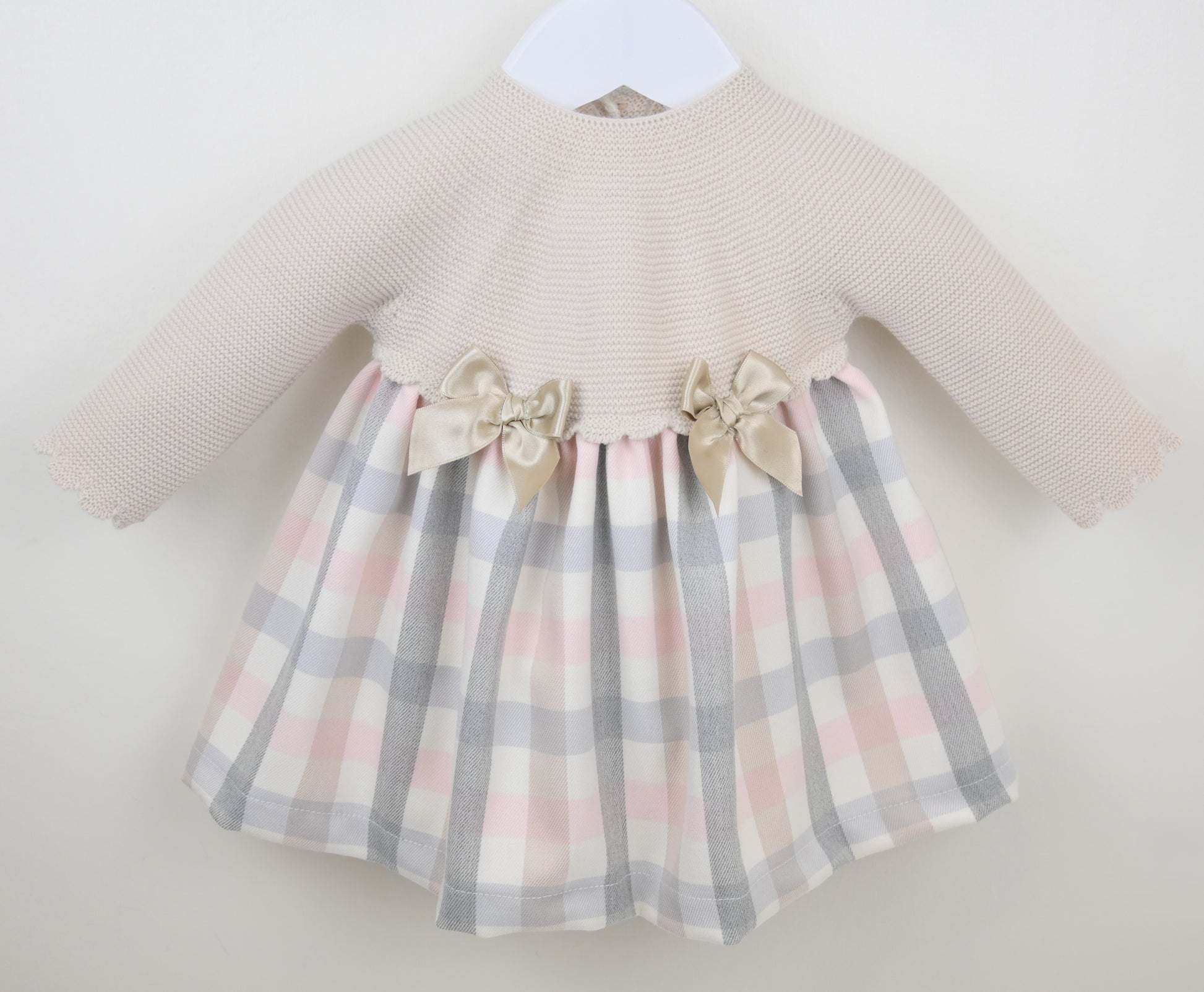 Dress your little one in charm with the Orla Dress, featuring a soft oat-coloured knitted top adorned with delicate satin bows on the front. Its classic style pairs comfort with a playful touch, making it perfect for special occasions or everyday adventures.