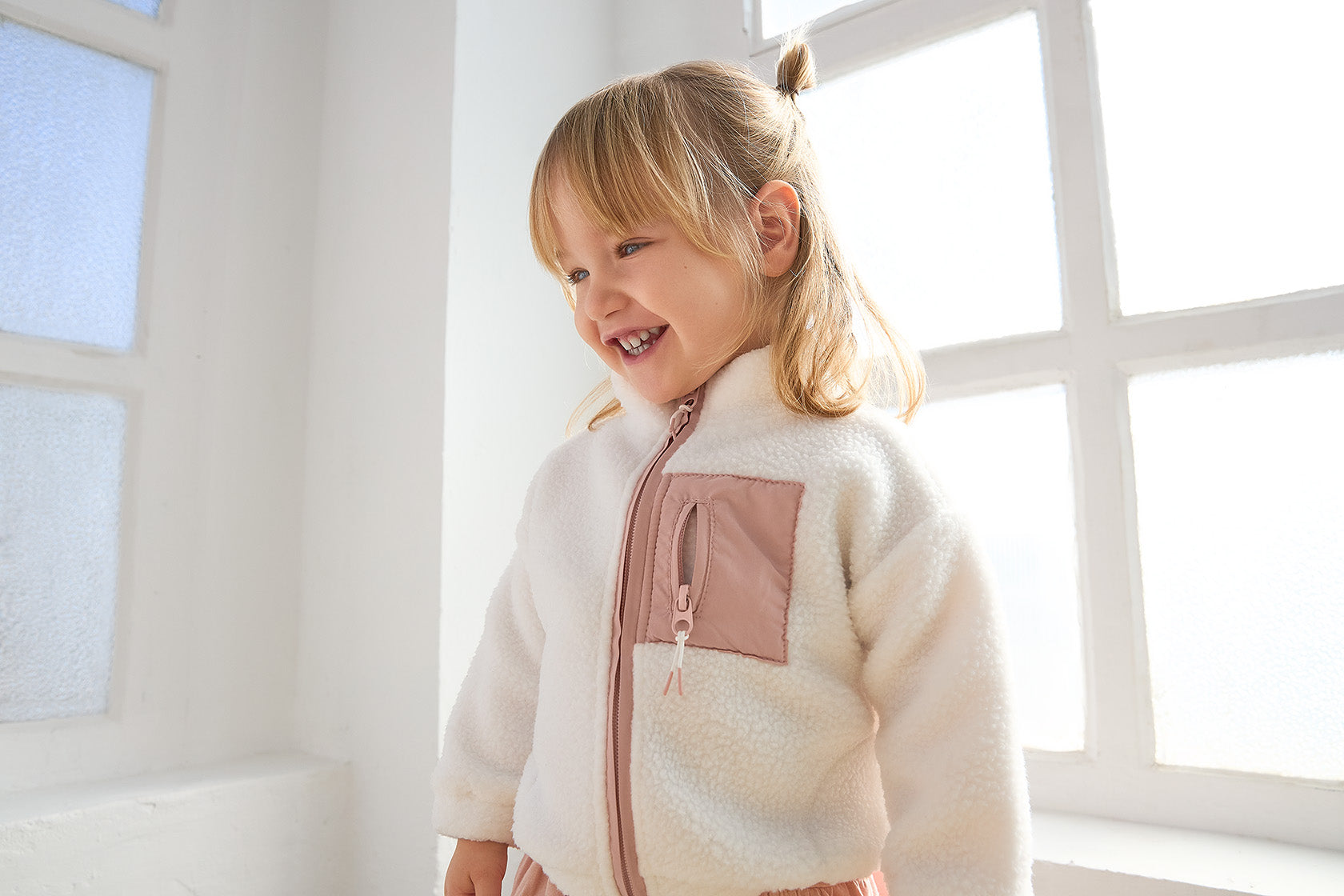 Keep your little one snug and stylish with this fluffy toddler girls fleece jacket. Featuring a soft white fabric accented by a playful pink pocket and zip, it wraps your child in warmth and cosiness during chilly days. Perfect for outdoor adventures or cosy indoor play, this jacket combines comfort with fun details that children will love.